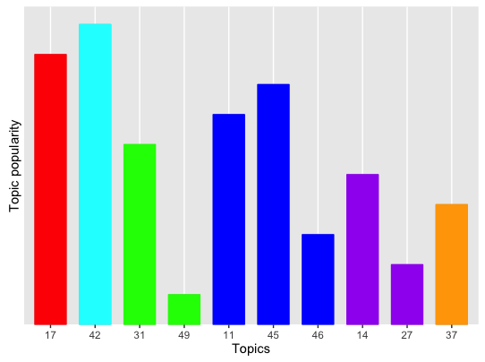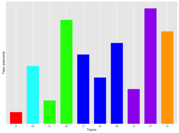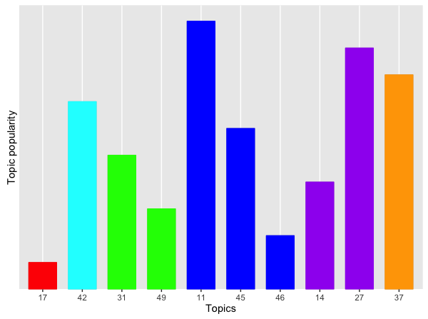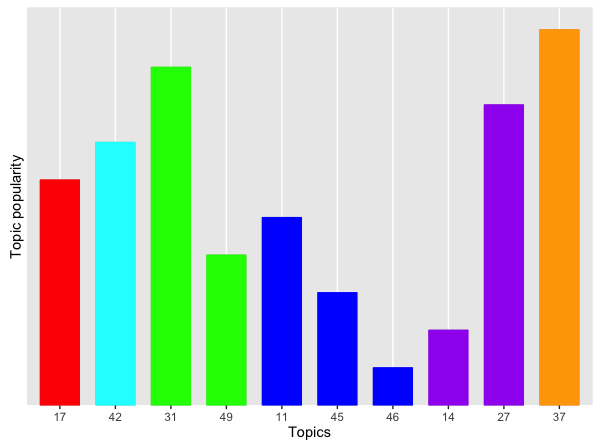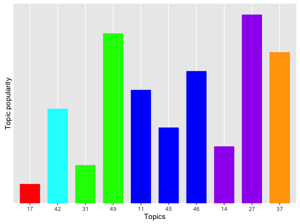 As they are probability distributions, topics do not come with "human-readable" labels. However, if you're lucky, some of them lend themselves to some kind of interpretations. Out of the original 50 topics, I selected ten which seemed amenable to being given a label. Specifically, I identified: