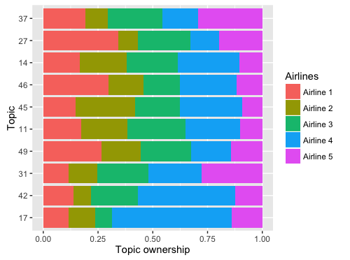 Topic ownershipTo conclude, I've looked at the allocation of topics to the 5 airlines I considered. The chart below shows the "topic ownership" for each topic. In this case, the counts are normalised be the total number of tweets allocated to each topic.