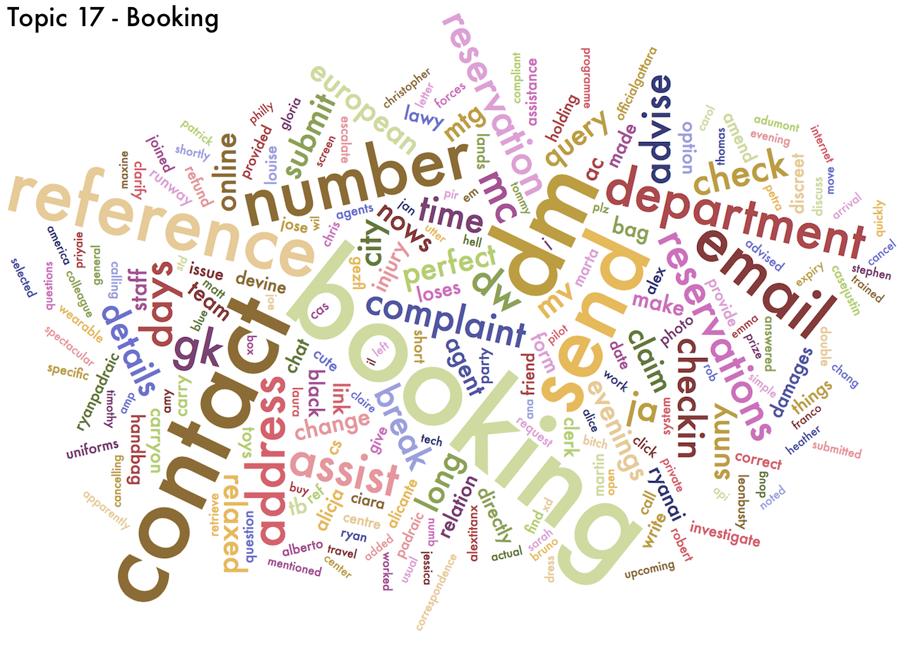 Let's now look at the most positive topic: Topic 17 (Booking). The same blue no-frills airline scores pretty high here. This reinforces my gut feeling that these tweets are probably promotional tweets by the airline itself.