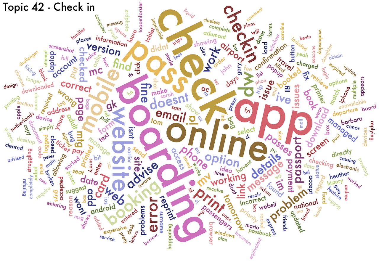 As seen above, Topic 17 (the most positive of all) is "owned" by airline 4 (those promotional tweets!). And so is topic 42, about checking in.