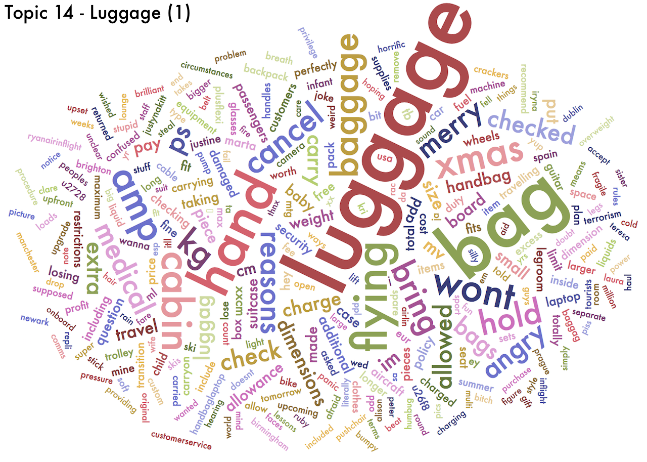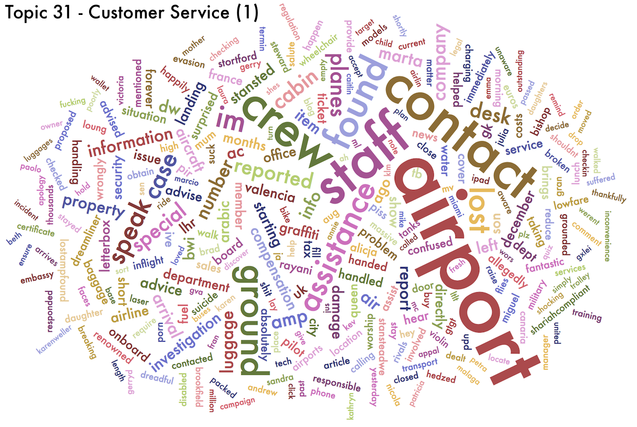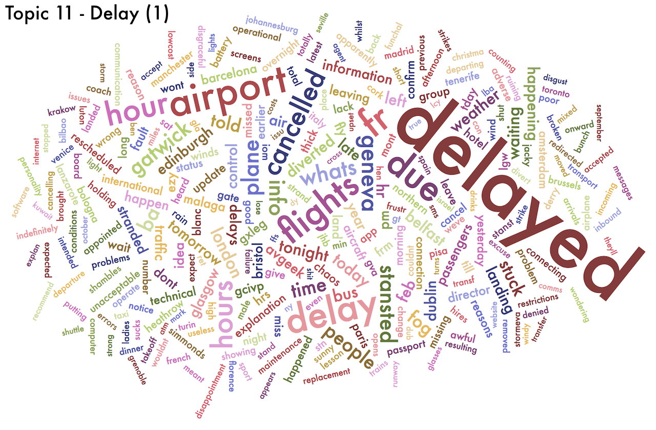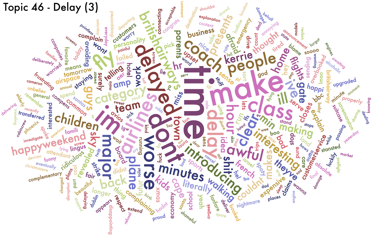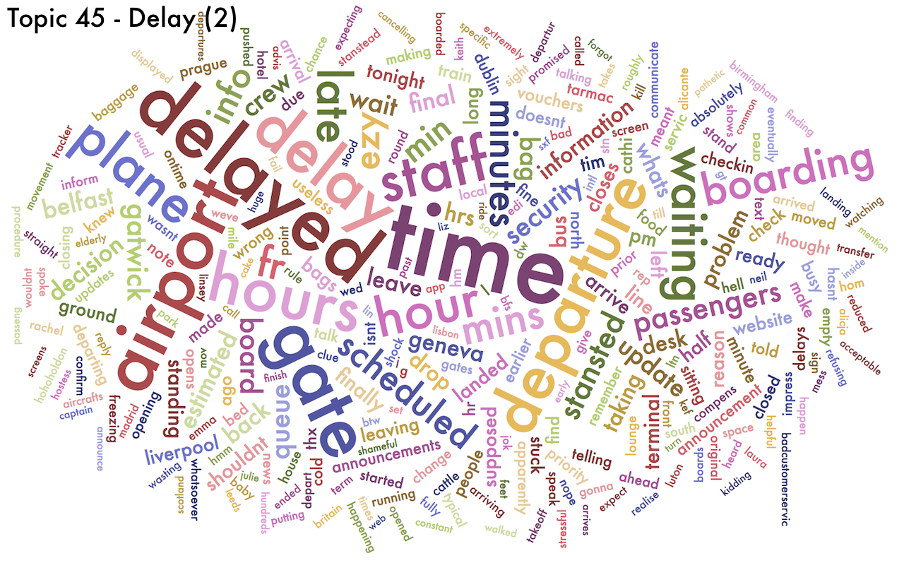 IntroductionI fly quite a bit between London and Barcelona. When choosing my flights, I have several airlines at my disposal. Admittedly, they're all quite similar, in that they are all economy-class only, hand-luggage heavy, no-frills kind of airlines. Despite this, I do perceive some difference between them. I was interested in finding out whether these differences in perception were shared by the wider travelling public. So I downloaded a bunch of tweets written during the month of December 2015 that mentioned five of the major airlines connecting London and Barcelona. Eventually, I got a dataset of about 29,000 tweets. I analysed these tweets by fitting a Latent Dirichlet Allocation (LDA) model. I had three objectives:
